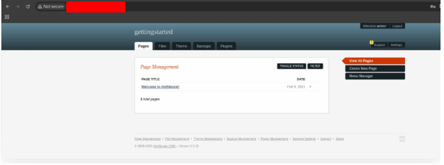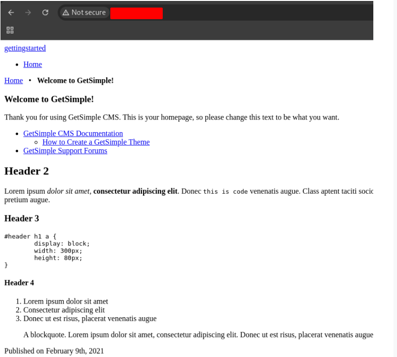 Back on the homepage, notice towards the top of the page the mention of GetSimple CMS Documentation. Let’s visit this page and see if we can find clues towards our next step.