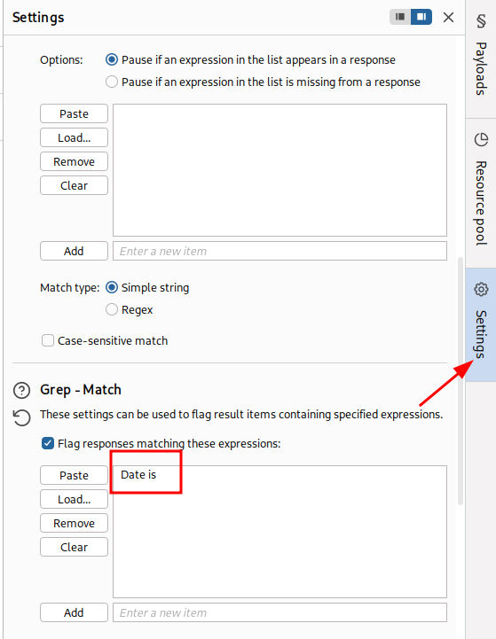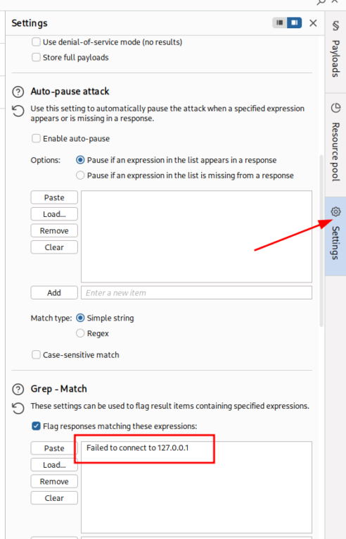 On the Settings tab, insert the text bellow to grep this text when we execute the attack