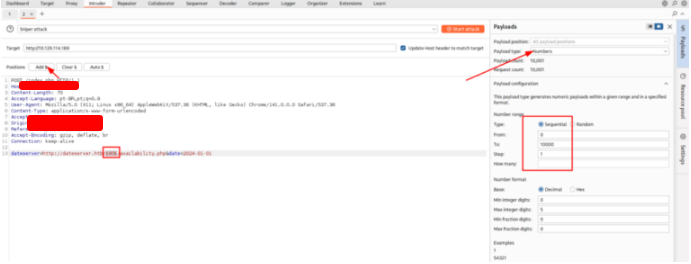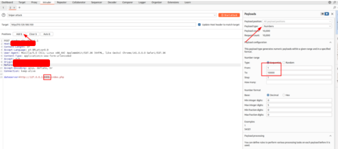 Let’s enumerate ports 1 through 10,000 to search for responses we know are correct. Right click on the request and choose Send to Intruder. Configure the attack.