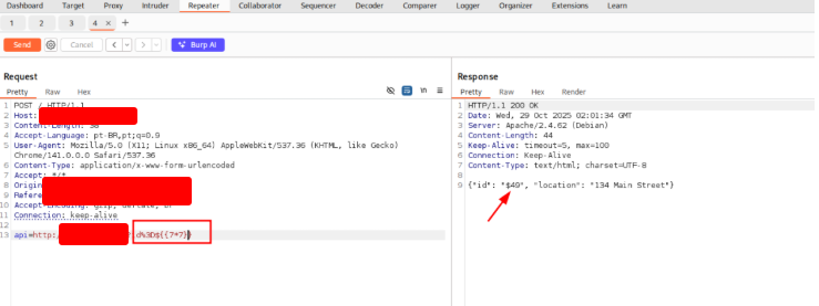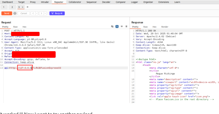 OK, the vulnerability exists. Change the IP to a internal IP. It works!! Now we want to search for other sevices that are running on this machine. Right-click on the request and choose Sent to Intruder.