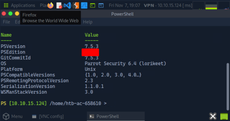 In Pwnbox issue the $PSversiontable variable using PowerShell. Submit the edition of PowerShell that is running as the answer.