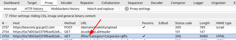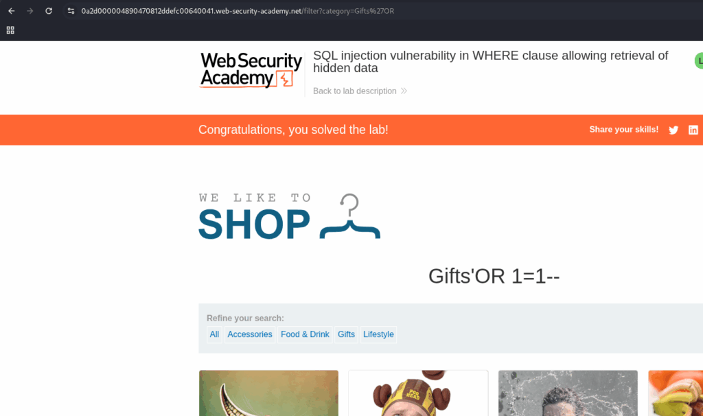 Lab: SQL injection vulnerability in WHERE clause allowing retrieval of hidden data