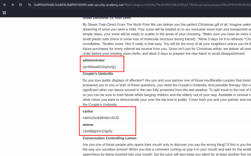 To solve the lab, perform a SQL injection UNION attack that retrieves all usernames and passwords, and use the information to log in as the administrator user.