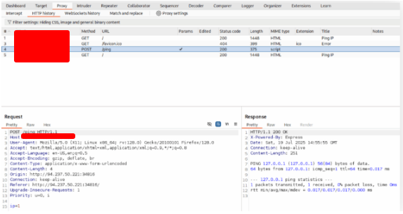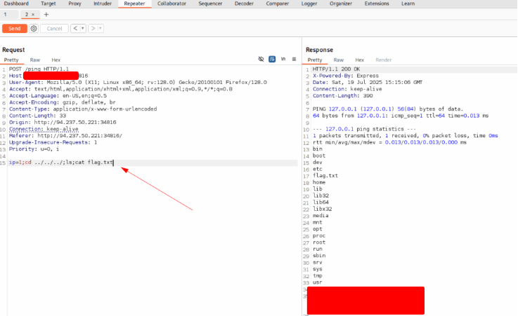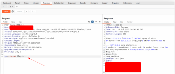 Try intercepting the ping request on the server shown above, and change the post data similarly to what we did in this section. Change the command to read ‘flag.txt’
